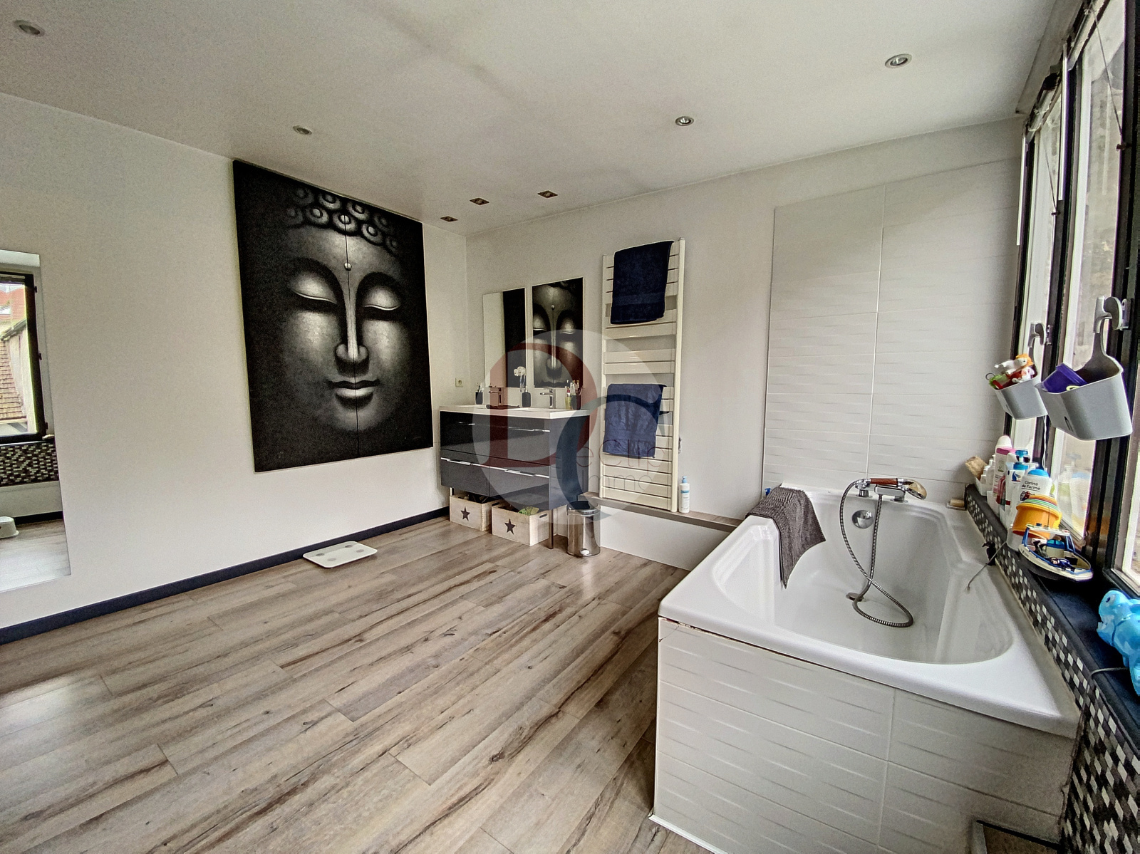 Elle se compose sur son rez-de-chaussée d'une salle à manger, une pièce servant de grand vestiaire (ou encore chambre), une cuisine semi ouverte, un salon baigné de lumière avec baies vitrées donnant accès à la terrasse, un cellier arrière cuisine pour le rangement et un cellier buanderie. A l'étage, un grand palier lumineux servant de bureau 11m² dessert un autre espace à vivre de 20m² (chambre possible), 2 chambres et une salle de bains avec WC. Le dernier niveau présente une chambre parentale de 33m² avec sa salle de bains.