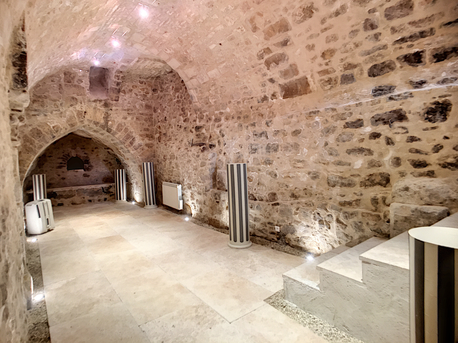 Du salon, vous pourrez accéder directement à une authentique cave voutée entièrement rénovée, aménagée, isolée et chauffée, dont les chapiteaux ont été datés du XIII ème siècle. Cette cave est organisée en 3 espaces dont une grande pièce de réception.